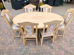Mooie witte vol eiken tafel met 6 eiken stoelen gestoffeerde zit en midden rug prijs 300€ (deze zijn nog in hele goede staat!