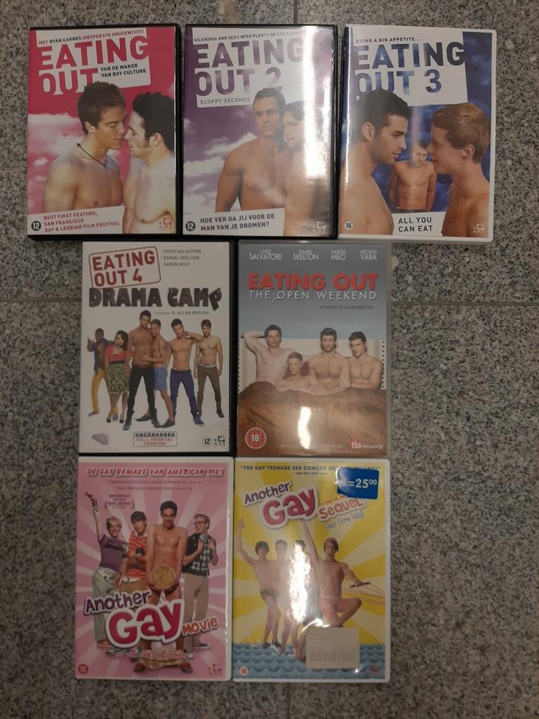 Volledige reeks van beide films reeks. Doe gerust een bod weg is weg verzenden kan, afhalen ook. 7 Dvd's eating out volledige reeks another gay movie volledige reeks erotiek, sex, naakt, bloot, pe