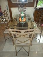 Glazen tafel (1m40 lang bij 82 breed en 74 hoog) met 6 stoelen in verouderd bruin metaal met taupekleurige zitting, prachtig!!!! A