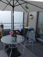 Grijze ijzeren poten en grijze randen dik glazen blad met een mooi reliëf in kan niet stuk kostte 110 euro kom gerust kijken.0473880914 Doorsnede is 1.20, Je kan in het midden een parasol plaatsen, zo