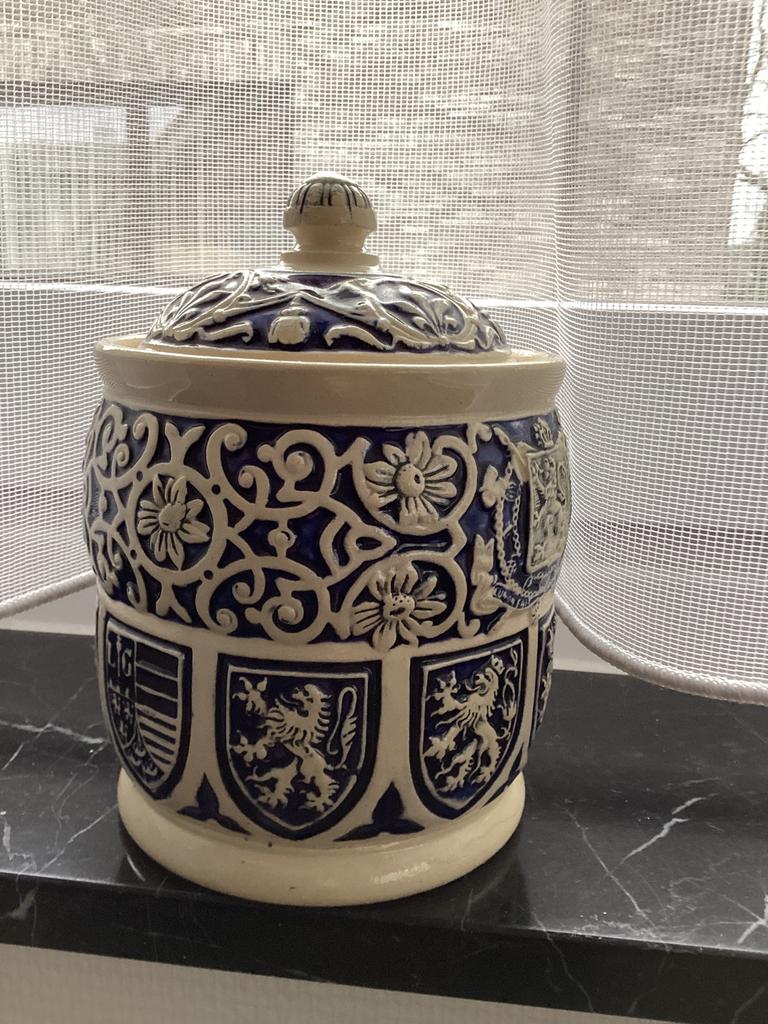Deze antieke duitse tabakspot van steengoed uit het westerwald is een prachtig verzamelobject uit het einde van de negentiende eeuw. Ontwerp: de pot is gedecoreerd met reliëfwerk, waaronder het belgis