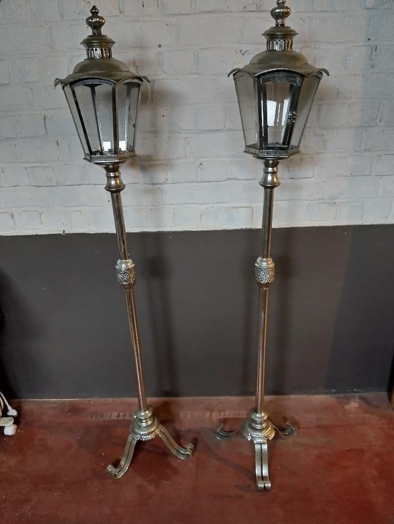 2 mooie tuinlantaarns , zilverkleurig. Zo goed als nieuw. Staan prachtig in de tuin of als decoratie naast een deur van een huis. Een glasvenster kan open ( zie 3de foto) om een kaars in te plaatsen .