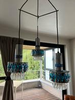 Vintage hanglamp uit de zeventiger jaren. De lamp heeft 3 kelken die uit een chromen kap met blauwe (eerder zeldzaam daar de meeste in oranje zijn) details bestaan, met daaronder een glazen kelk. Het