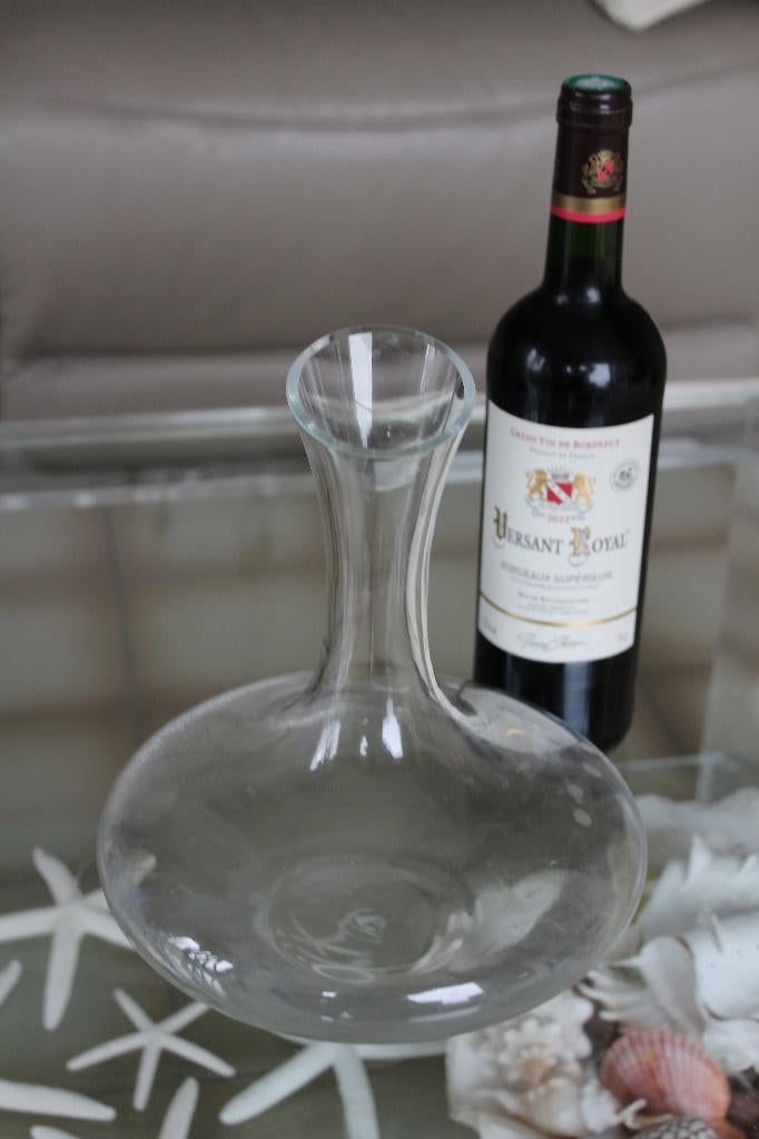 Karaf voor het decanteren van wijn hoogte 24 x diameter 22 cm prachtige transparantie en dik glas nieuwprijs 14 euro afhalen of verzenden bpost 7620 guignies gsm: 00 32 (0) 487.37.19.55.