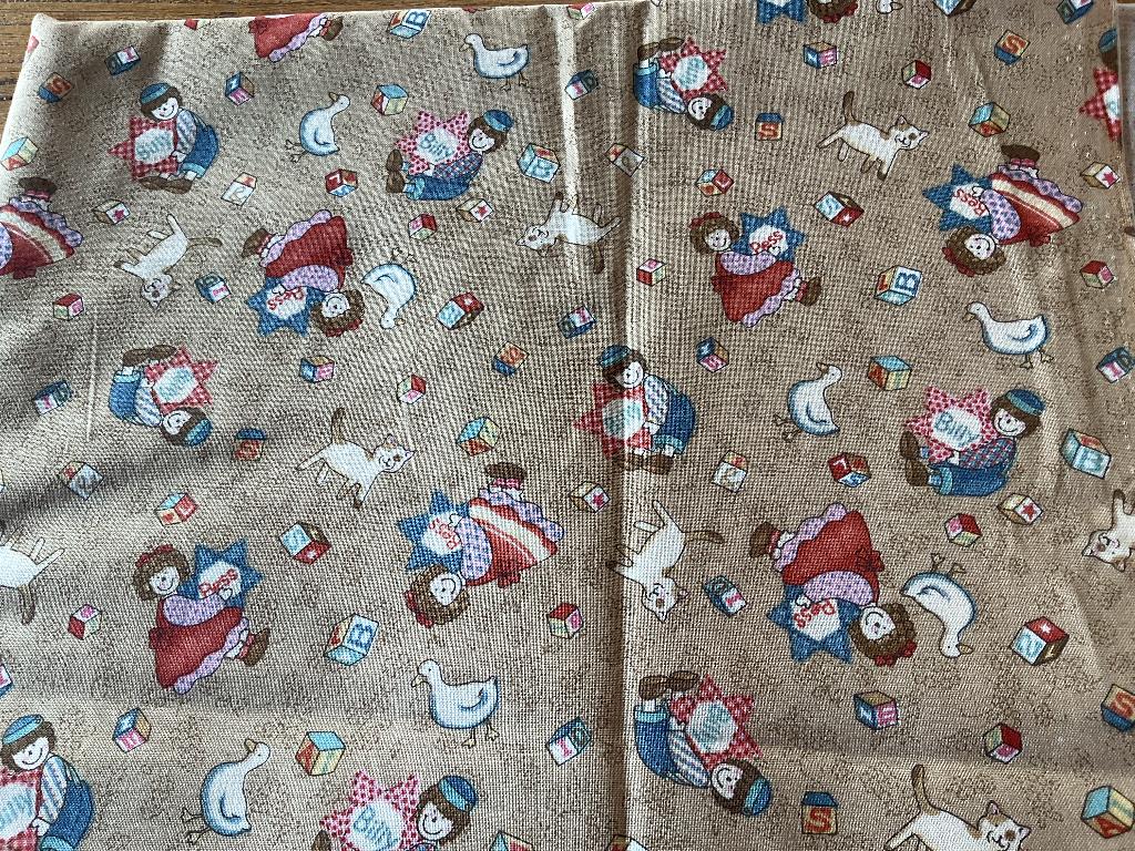 Prachtig stofje, naaistofje, katoen. Om te quilten , kinderkledij, gordijntje vr de kinderkamer, om houten dozen te bekleden, ook heel mooi en apart. Het is een prachtige afbeelding, schaapjes, kindje