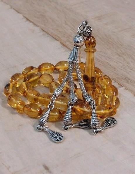 33lü damla kehribar tesbih capsul kesim gümüş püsküllü 11x7,5mm