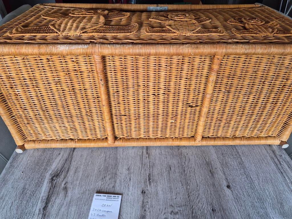 Coffre en osier avec trace d' usure voir photo . Dimensions : longueur 90cm , hauteur 43cm , largeur 36cm 40€ a discuter 0495928084