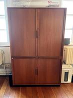 2 bureelkasten in teak met schuifdeuren telkens bestaande uit 2 delen. Afmetingen h 192 x d 41,7 x b 127 cm bovenkast h 111,5 cm o