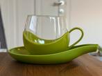 Mellita set van 3 groene glazen tassen met plastic houder en onderbord. Jaren 60/70. In zeer goede staat.