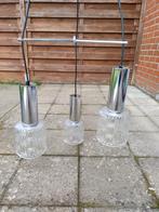 Prachtige watervalophanging uit de jaren 60 gemaakt van verchroomd metaal. 3 Glazen lampenkappen met textuur. In perfecte staat en werkt.