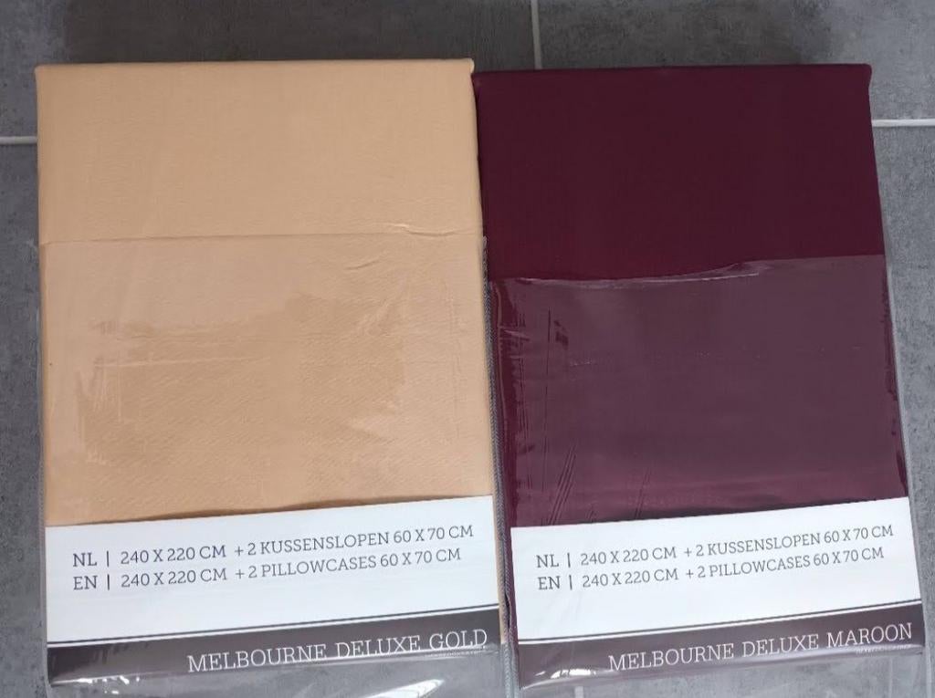 Nieuwe dekbedovertrek met 2 kussenslopen van 60x70cm, is strijkvrij, vochtregulerend, sneldrogend en kreukvrij, met drukknoopsluiting, in 3 kleuren zie foto's, per stuk 10€ 240x220cm, goudgee