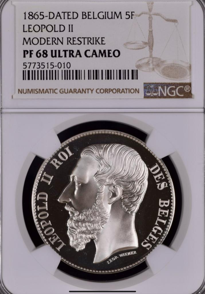 Belgium 5 Francs 1865 Restrike Zilver PF68 Ultra Cameo