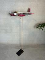 Groot houten speelgoed vliegtuig. Zichtbare gebruikssporen maar daarom niet minder decoratief. Gemonteerd op hoge ranke steun. Spa