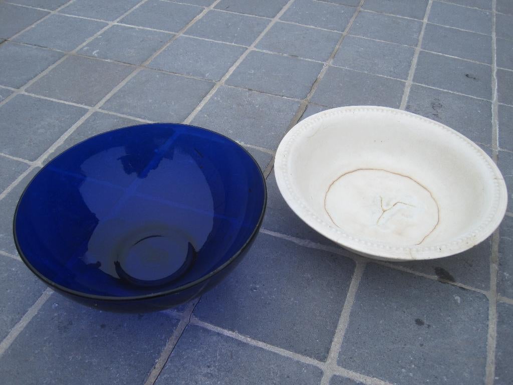 3x schalen. 2X in glas en 1x in email. De roze is een kleine beschadiging aan. €9/stuk. Tel 0478/493295