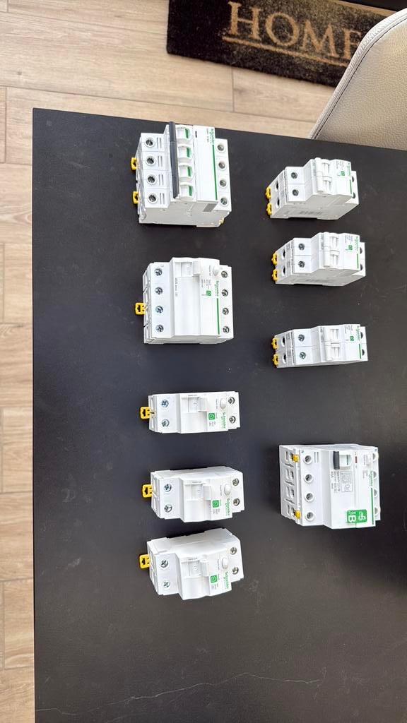 3x differentieel 30 ma 40a 2p 25€ per stuk 1x differentieel 30ma 40a 4p 35€ 1xdifferentieel 30ma 40a 4 p klasse b laadpaal175€ 1xzekering 32 a 4 p 30€ 2x zekering 32a 2 p 20€
