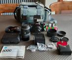 Minolta fototoestel met toebehoren en draagtas, toestel blokkeert. Alle toebehoren zoals lenzen zijn in perfecte staat.