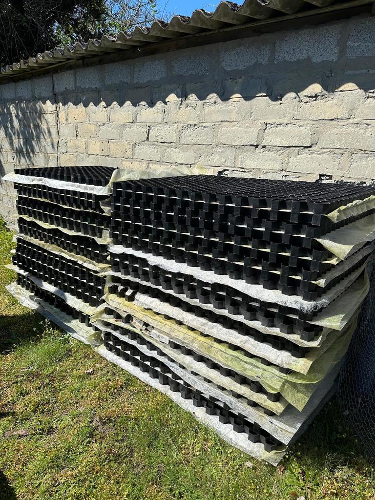 Honinggraadmatten voor kiezelsteentjes. Gekocht om oprit aan te leggen maar wegens familiaal overlijden kunnen we dit niet zelf en gaan we het zo laten. Nooit gebruikt, ze hebben enkel buiten opgestap