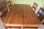 Vol houten tafel met de bijpassende 4 stoelen. Zeer goede staat. Tafel 1,20 m op 75 cm.