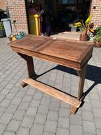 Houten schoolbank met 2 opbergvakken. Beide met scharnierend oppervlak. Inktpot is volledig en zonder schade.