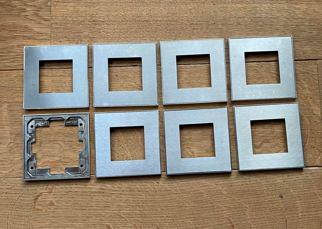Afdekplaatjes lithos in rvs voor stopcontacten. 8 Frames, 7 afdekplaatjes. Geen stopcontacten erbij. Gebruikt.