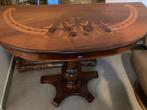Italiaans design, fijn afgewerkt fineer bijzettafeltje. Mooi bloemenmotief. Half rond. Met lade. 90 Cm breed 38 cm diep 77 cm hoog