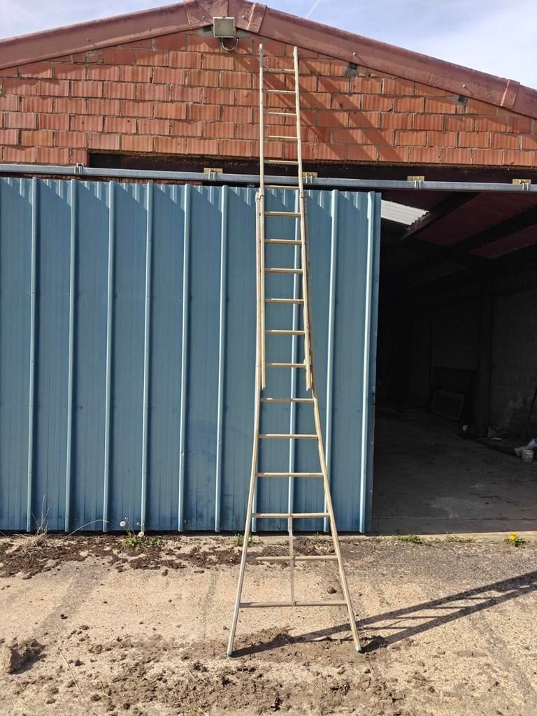 Uitschuifbare aluminium schuifladder. Totale lengte 5.8 M. Opgelet! Haak afgebroken (zie foto's).