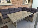 Rieten lounge set met kussens lichte gebruikssporen zichtbaar zelf op te halen. Verzending niet mogelijk. Tafel met glazen top. Vo
