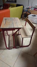 Oud schoolbureau, metalen buisvormige structuur. Opslagruimte onder de tablet. Afmetingen: -breedte: 70 cm -diepte: 80 cm -zithoogte: 42 cm -tablet hoogte: 71,5 cm (voorkant); 73 cm (achterkant) -tabl