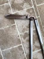 Een heggenschaar met lange handgrepen in gebruiksklare toestand.