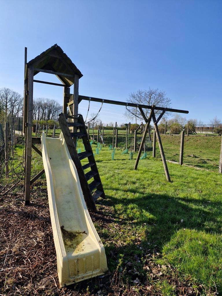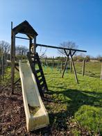 Schommel met huisje, inclusief glijbaan en 2 schommels. Bovenbalk is vernieuwd. Houten ladder is aan vervanging toe.