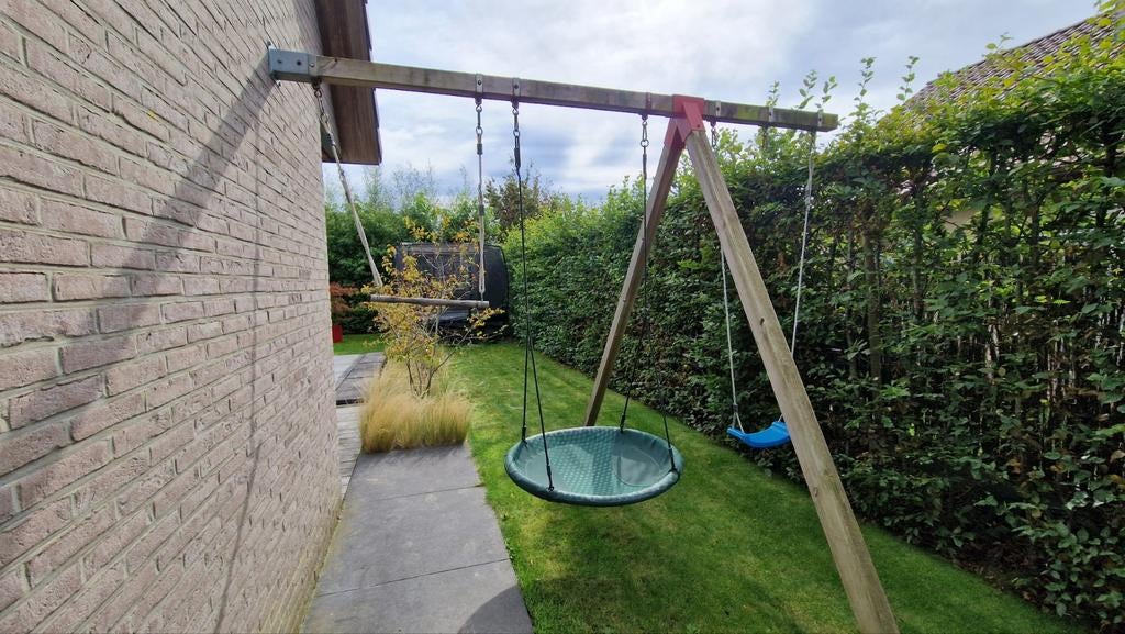 Schommel om 3 toestellen aan te hangen. Werd reeds door ons uitgebroken. Nog in goede staat. Incl. De 3 toestellen. Afstand tot onder bovenste balk. 2M50. Balken nog in goede staat. Schuine balken 3m4
