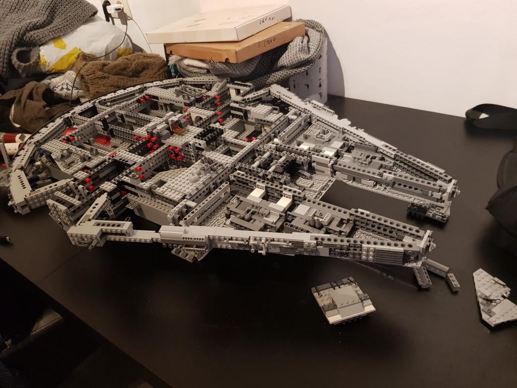 75105 : complete set als nieuw met minifiguren, bouwboeken en doos. Ucs 10179 : +/- 90 à 95 % compleet maar wel zonder bouwboeken, zonder doos en slechts 1 minifiguur (chewbacca). Legostukken in goede
