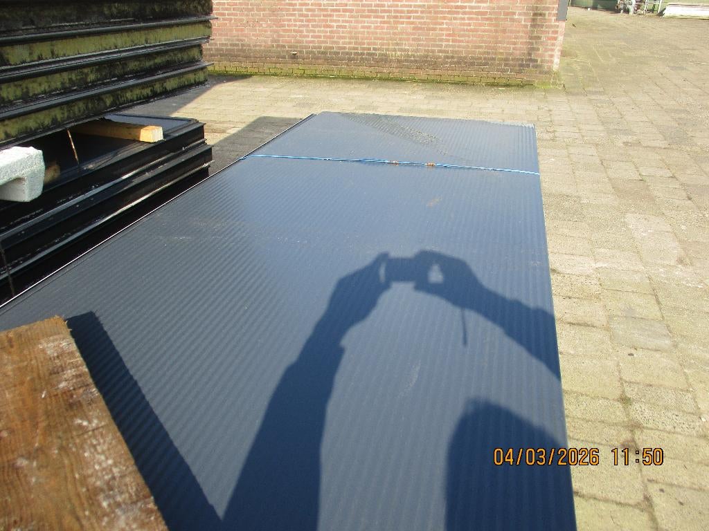 Antraciet sandwichpanelen 10 cm dik 100 cm breed en 715 cm lang met verborgen bevestiging totaal 120 stuks , 858 m2 de grijze buitenkant is netjes de binnenkant is niet netjes door brand binnen is er