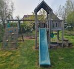 Speeltoestel, speelhuis, speeltoren. Merk jungle gym glijbaan klimmuur klimnet schommel het zijn verschillende delen, zie foto'