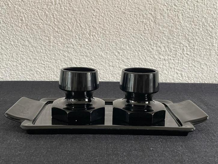 Zwarte persglazen ontbijtset bestaande uit een plateautje met handvaten voor toast en twee geometrische eierdoppen.