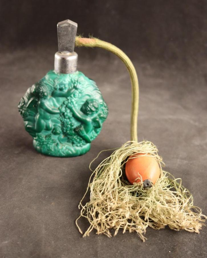Fraai antiek van malachietglas gemaakt Art Deco parfumflesje dat prachtig is gedecoreerd met cherubijnen.