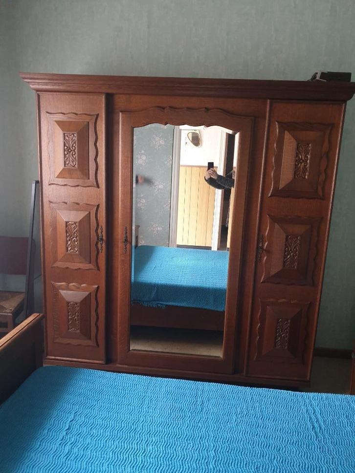 Deze kleerkast met ingebouwde spiegel mag ook verhuizen. Ook het bijhorende bed en nachtkastje staat nog te koop. Zie aparte zoekertjes hierover.