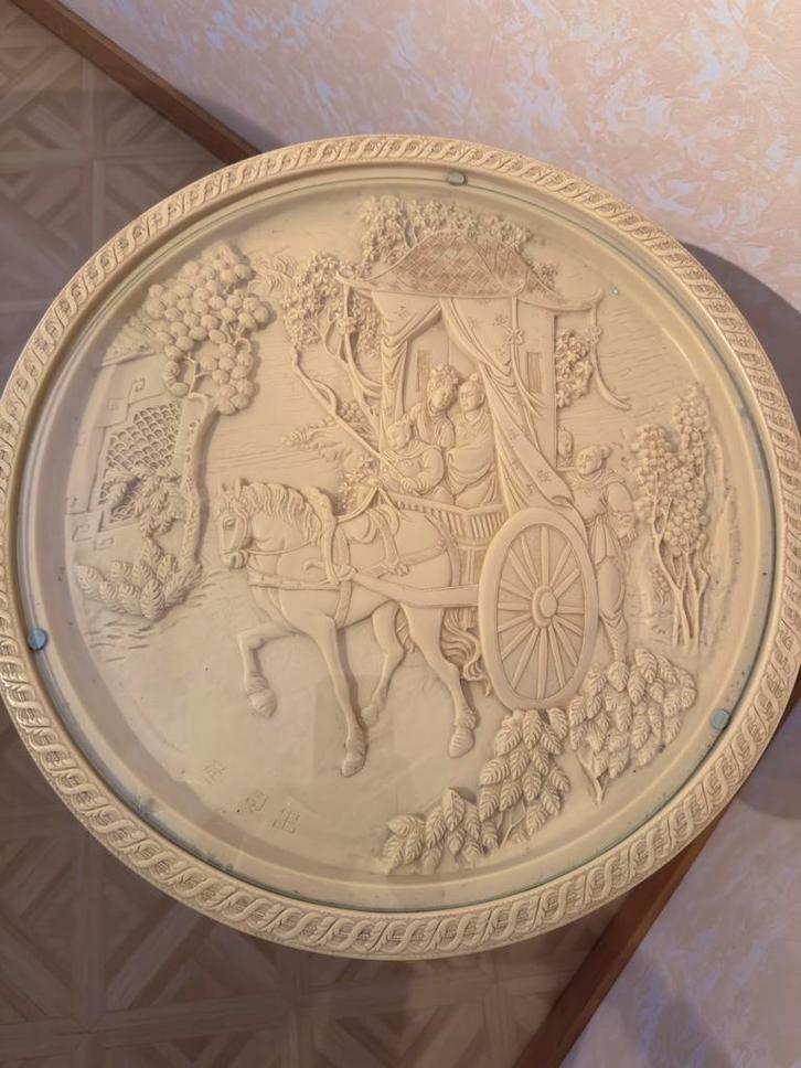 Vintage bijzettafeltje met een gedetailleerd Chinees reliëf. Het toont een traditionele Chinese paardenkoets met een koetsier, koninklijke passagiers en bedienden in een weelderige tuin. Stijl ivoorsnijwerk. 50cm hoog en 46cm diameter. Op te halen in Bree.
