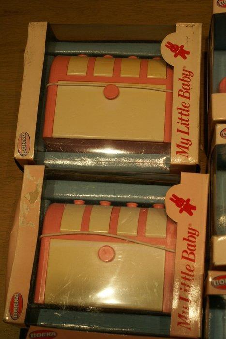 Een hele collectie van my little baby Sekiguchi. bestaande uit verschillende attributen om met de poppen te spelen. de set bestaat uit 2x kast, ongeveer 12x10 cm, 1 heeft lichte verkleuring door zonlicht. 1x schommelpaard2x bed met lade, ongeveer 16x10 cm, 1 heeft hier ook lichte verkleuring door zonlicht1x loopauto, raceauto1x speelgoedtreintje hout3x ringwerpen (alledrie compleet,bij één staat er het touw niet op foto)1x hoedje1x tekenboekje met potloodjes, konijn en kussentje1x tasje2x luierbroekje3x telraam hout2x tafel met twee stoelen, 1 set is in originele doos, de andere zonder de doos. al het speelgoed is nieuw, de dozen zijn meestal goed of hebben wat stockagesporen. leuk speelgoed uit 1986.