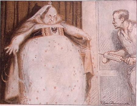 Te zien op de prent zijn Nazisme en Boycot. Het nationaalsocialisme, vaak afgekort tot nazisme, is een ideologie die nauw verwant is aan het fascisme en na de Eerste Wereldoorlog in Duitsland ontstond. Duitsland De swastika is een eeuwenoud symbool uit de Indusbeschaving dat in meerdere Euraziatische culturen voorkomt, maar door de nazi's werd gebruikt als hakenkruis.