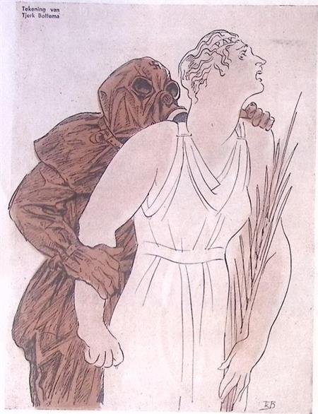 Tjerk Bottema maakte deze spotprent als onderdeel van de weekkrant De Notenkraker. Deze krant was een Nederlands politiek-satirisch weekblad, altijd voorzien van originele spotprenten. Deze prent is bijna honderd jaar oud. Het papier kan op plekken beschadigd zijn, zie de foto's voor de details om te zien wat de exacte staat van de prent is.
