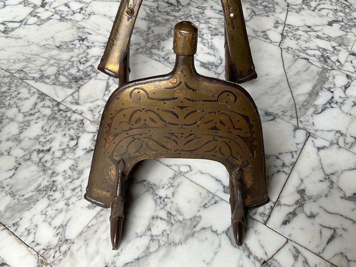 Egyptecampagne (1798-1801)Mooi zadel van de kameelMet twee lange gebogen armen en drie bogen van gelakt palmenhout, mooi en overvloedig versierd met versterkingen en decoratieve platen in gehamerd en gegraveerd ijzer en brons. (Enkele oxidaties).Directoire-periode, Campagne van Egypte.HISTORISCHOp datum uit het Quartier Général van Caïro op 20 Nivôse An VII (9 januari 1799) geeft Bonaparte, opperbevelhebber van het Oosterse Leger, opdracht aan de chef van de escadron Cavalier, de commissaris Colbert en kapitein Farnières om een regiment dromedarissen op te richten. Dit regiment werd ontbonden op 18 Fructidor An IX (5 september 1801). Deze dromedarissen werden in het Quartier van Boulak in Caïro vervaardigd.