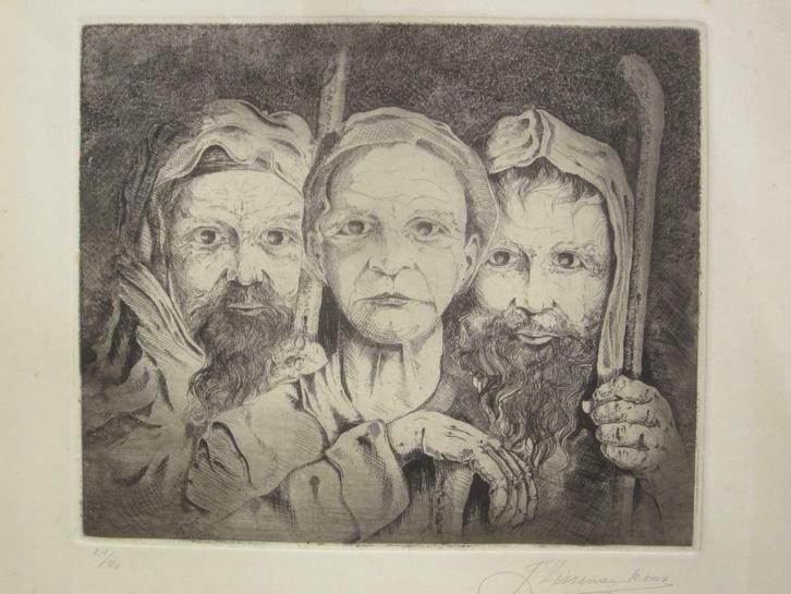 Mooie ets op papier, stelt een groep landlieden of bijbelse figuren voor, een man en twee vrouwen. Zeer scherpe, gedetailleerde ets, hoge technische kwaliteit. Niet gedateerd, wellicht jaren 60 of 70. Onderaan rechts in potlood gesigneerd J. Of L. Vissenaekens, links genummerd 21/40, links onder bij bladrand notitie”1300 D”. Afmetingen afbeelding: 24.2x20 cm, blad: 37.5x39.5 cm. In behoorlijke staat voor leeftijd en gebruik. Verschillende plooien in de rand van de grafiek, die kunnen bedekt worden door een passe-partout. Drie lichte plooien lopen door tot in de afbeelding zelf, die vallen weinig tot niet op, zoals te zien is op de foto’s. Verder: kleine bruine vlekjes (foxing) en een paar zwarte vlekjes in de rand, niet in de afbeelding zelf. Achteraan: resten van oude bevestiging in bruin papier, eventueel te verwijderen. Op sommige foto's lijkt het blad wat gekruld, komt door de wind buiten, is niet blijvend. Al bij al in OK staat. Op sommige foto's zijn naar het midden toe twee grijze vlekjes te zien, het gaat om stof op de lens van mijn camera. Detailfoto’s en foto’s in hoge resolutie verkrijgbaar op vraag. Verzending (bPost) of ophalen (buiten, op afstand, met mondmasker) mogelijk.