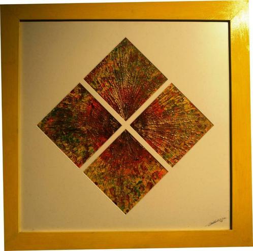 3 delig werk ; afm elk 93,*93 kader.... 78*78 werk;;; elk paneel bestaat uit 4 apparte achte rpasse partout geplaatste schilderijen ;; getekend ,,2003 MD ;; alle 3 tesamen ;; rode ; gele en blauwe kader
