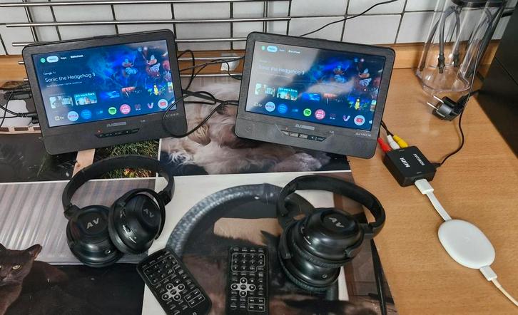 Dvd schermen met hoofdsteunbeugels, afstandsbediening en hoofdtelefoons compleet met alle kabels. Extra ! 2 modules met een hdmi ingang, gebruikt voor chromcast, apple tv, of andere hierdoor is streaming mogelijk. Werkt perfect, kan getest worden. Chromecast op de foto is niet inbegrepen.