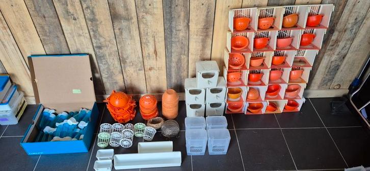 24 drinkbakjes, 24 anti smos eetbakjes, 24 nestkastjes voor kanaries, 5 nestkastjes voor eventueel gouldamandines, 4 grote anti smos eetbakjes, nog losse nestkastjes.
