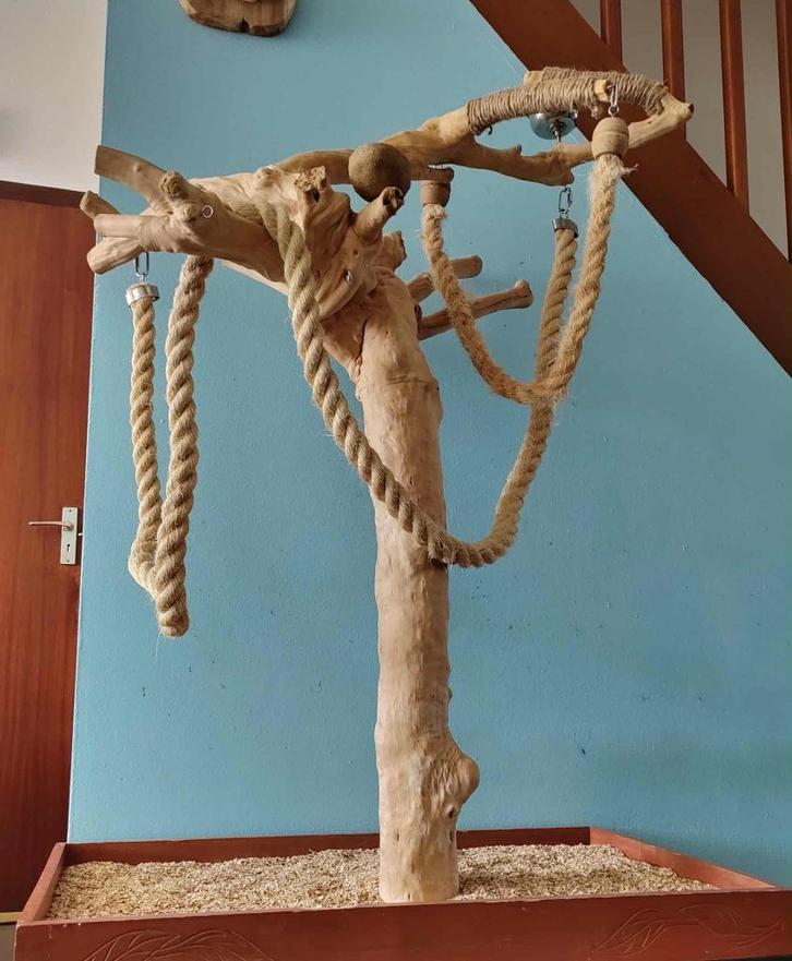 Er zitten voederbakjes op en meerdere ogen om speeltjes aan te hangen. De boom staat op een opvangbak. Hierdoor valt er bijna niks op de grond als de vogels iets laten vallen.