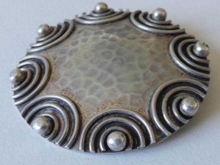 Fernand Grange broche gesigneerd sterling zilver 1925/1930 Art Deco. Modernistische ronde broche in gehamerd zilver uit de jaren 20/30. Ingesneden handtekening van de kunstenaar Dinandier FERNAND GRANGE. Keurmerk van de meestergoudsmid „Fernand Grange” en titelstempel.