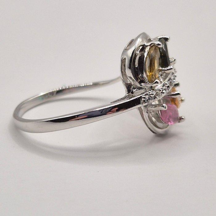 Deze elegante ring toont zes natuurlijke tourmalines in levendige tinten roze, groen en goudgeel. Elk edelsteen is fijn geslepen in de marquise-vorm en meet ongeveer 6,2 × 2,4 × 2,4 mm, met een geschatte gezamenlijke gewicht van ongeveer 1,35 karaat.De edelstenen zijn gerangschikt in een sierlijke golfvorm, versterkt door een rij witte accentstenen, waardoor het stuk zowel schittering als beweging krijgt. Gemaakt van S925 sterlingzilver, draagt de ring een duidelijk keurmerk aan de binnenkant van de band, dat de zuiverheid van het zilver bevestigt.Alle edelstenen zijn professioneel getest, wat hun echtheid bevestigt. Het ontwerp combineert harmonieus kleur en licht, waardoor een verfijnd en vrolijk statement stuk ontstaat.Specificaties:Metaal: S925 Sterlingsilver (gewaarmerkt)Totaal gewicht: 2,24 gHoofdzaken edelstenen: Natuurlijke Toermalijnen (6 stuks)Vorm & Snede: MarquiseAfmetingen: ca. 6,2 × 2,4 × 2,4 mm elkGeschatte totale gewicht: ~1,35 ctRingmaat: Binnen diameter 17 mmBehandeling van edelstenenAlle edelstenen worden beschouwd als behandeld met internationaal aanvaarde en standaardmethoden, tenzij anders vermeld.Verzonden met verzekering en veilig verpakt, met tracking via UPS.