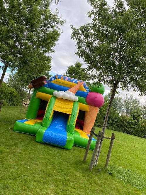 Verhuur springkasteel ice cream met glijbaan en met leuke obstakels in thema van ijs.